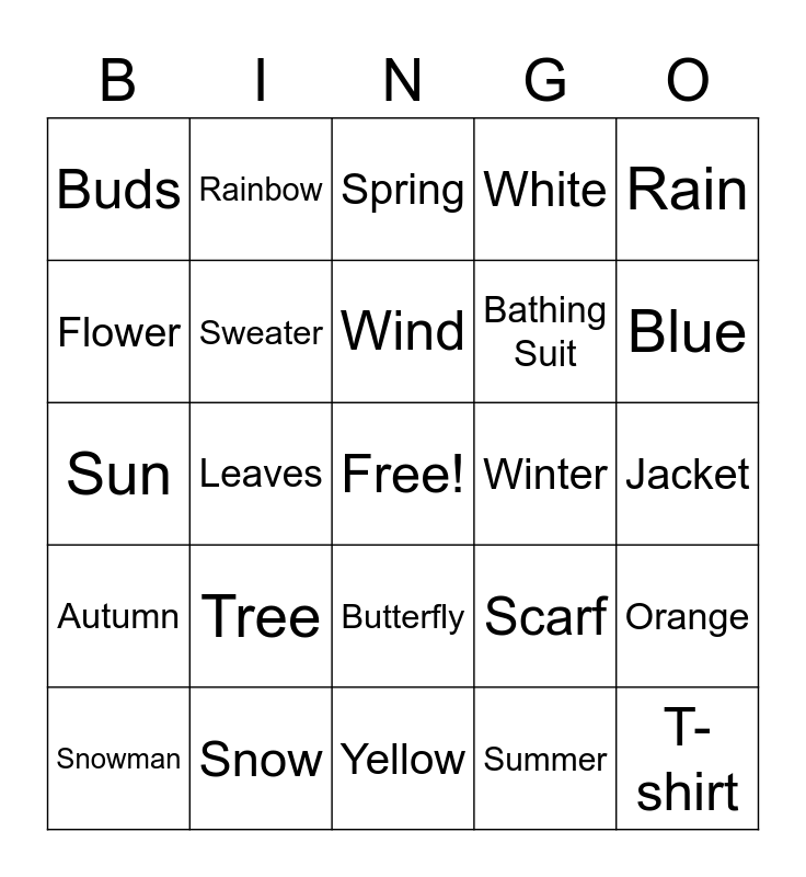 This bingo card has a free space and 24 words: Tree, Snow, Wind, Snowman, Rain, Buds, Flower, Rainbow, Winter, Butterfly, Bathing Suit, Sun, Scarf, Orange, Sweater, Summer, Jacket, Spring, Blue, Leaves, T-shirt, Autumn, White and Yellow.