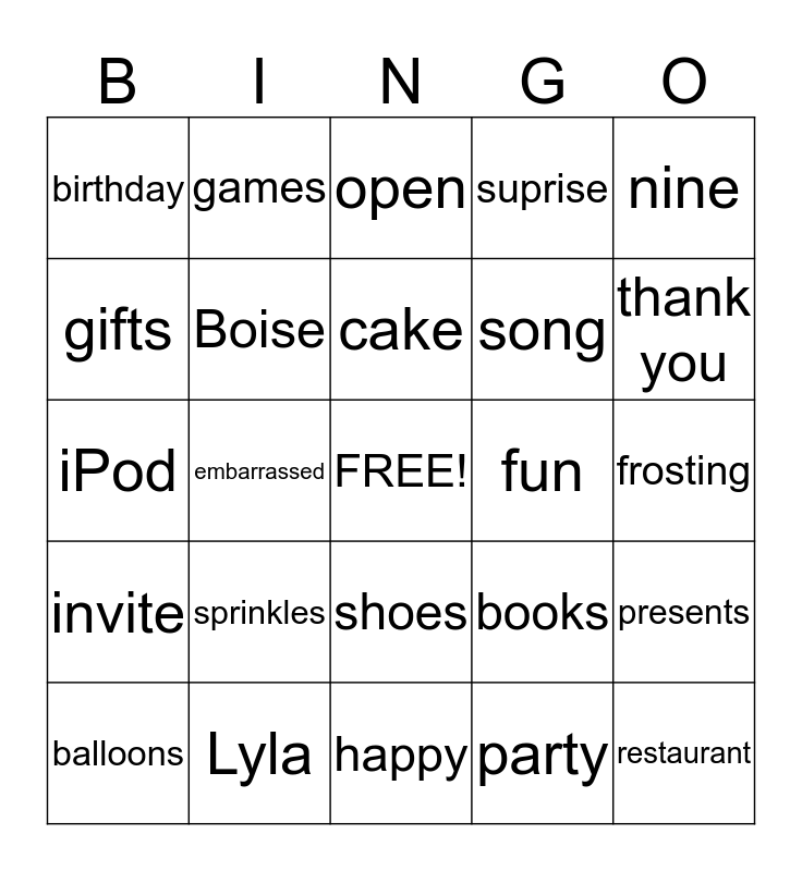 This bingo card has a free space and 24 words: sprinkles, Lyla, cake, balloons, nine, birthday, gifts, games, fun, shoes, song, iPod, books, presents, Boise, party, frosting, open, thank you, embarrassed, restaurant, invite, suprise and happy.