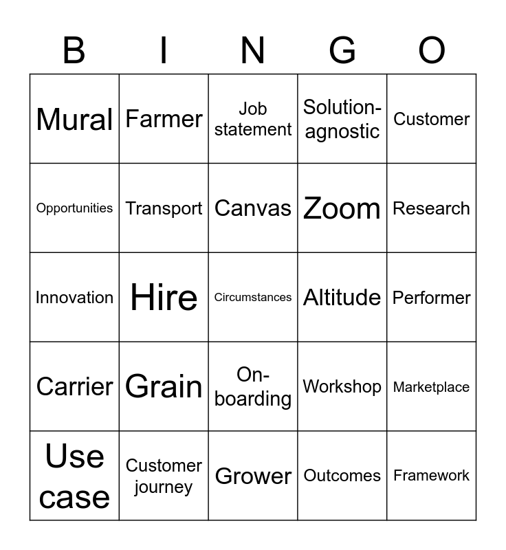 This bingo card has 31 words: Grower, Job Map, Hire, Carbon, Mural, Job statement, Transport, Workshop, Altitude, Outcomes, Performer, Circumstances, Framework, Contextual clarifier, Research, Indigo, Marketplace, Grain, Carrier, On-boarding, Customer, Mute, Use case, Farmer, Zoom, Opportunities, Solution-agnostic, Innovation, Customer journey, Canvas and Switch.