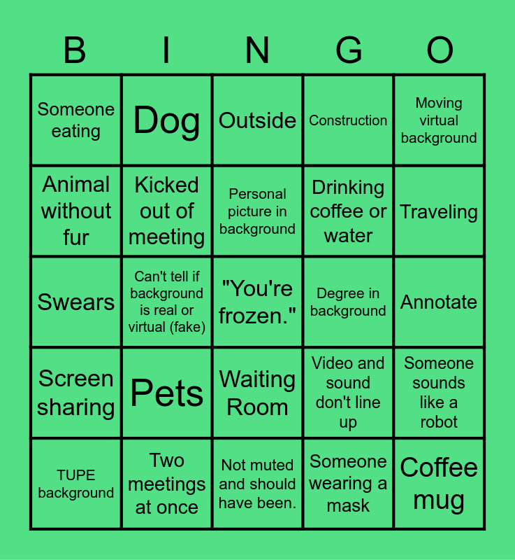 This bingo card has 52 words: "You're muted.", "You're frozen.", "I was muted.", Not muted and should have been., Pets, Cat, Dog, Animal with fur, Animal without fur, Someone dozes off, Kicked out of meeting, Got a "You're internet is unstable message", Someone sounds like a robot, Video and sound don't line up, Kid(s) appearance, Someone in background, Personal picture in background, Degree in background, Book in background, Moving virtual background, Can't tell if background is real or virtual (fake), Someone wearing a mask, Someone eating, Drinking coffee or water, Water bottle, Coffee mug, Earbuds / headphones, In a car, Traveling, Background noise, Water running, Construction, Siren/Alarm, Ice cream truck, On vacation, Outside, Two meetings at once, First chat you see (freebie), Resource link shared in chat, Breakout rooms, Polling, Annotate, Screen sharing, Co-Host, Waiting Room, Stress reliever – stress ball, fiddle item, Stretch break, Swears, virtual thumbs up, "Is that your real house?", TUPE background and "Can you hear me?".