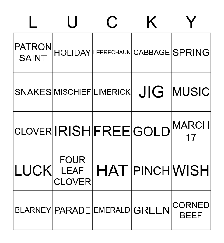 This bingo card has a free space and 32 words: GREEN, ST. PATRICK, IRISH, RAINBOW, LUCK, MISCHIEF, SPRING, WISH, HOLIDAY, KILT, LIMERICK, LEPRECHAUN, IRELAND, CELTIC, GOLD, LEGEND, BLARNEY, CLOVER, HAT, FOUR LEAF CLOVER, PINCH, SHAMROCK, MARCH 17, PARADE, CORNED BEEF, CABBAGE, JIG, SNAKES, PATRON SAINT, EMERALD, CATHOLIC and MUSIC.