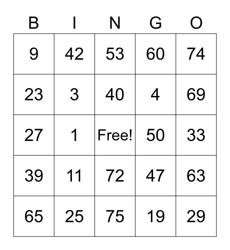 This bingo card has a free space and 24 words: 11, 25, 40, 65, 74, 9, 23, 42, 50, 72, 4, 27, 47, 63, 3, 19, 33, 53, 69, 1, 29, 39, 60 and 75.