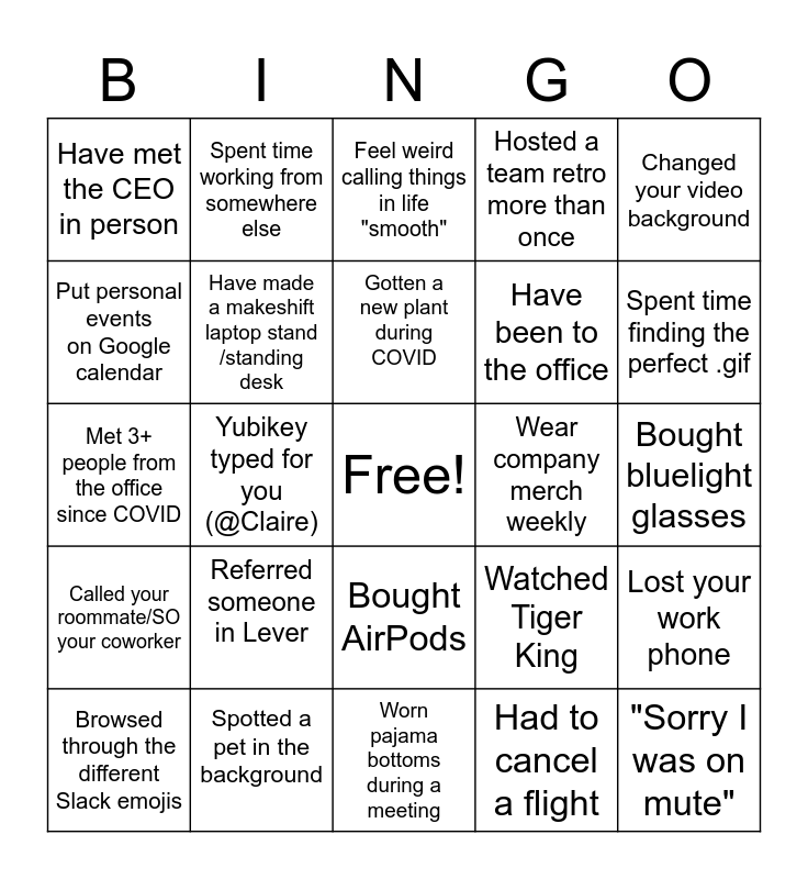 This bingo card has a free space and 24 words: Referred someone in Lever, Spotted a pet in the background, Gotten a new plant during COVID, Browsed through the different Slack emojis, Changed your video background, Have met the CEO in person, Put personal events on Google calendar, Spent time working from somewhere else, Wear company merch weekly, Bought AirPods, Have been to the office, Met 3+ people from the office since COVID, Watched Tiger King, Lost your work phone, Have made a makeshift laptop stand /standing desk, Had to cancel a flight, Bought bluelight glasses, Feel weird calling things in life "smooth", Spent time finding the perfect .gif, Yubikey typed for you (@Claire), "Sorry I was on mute", Called your roommate/SO your coworker, Hosted a team retro more than once and Worn pajama bottoms during a meeting.