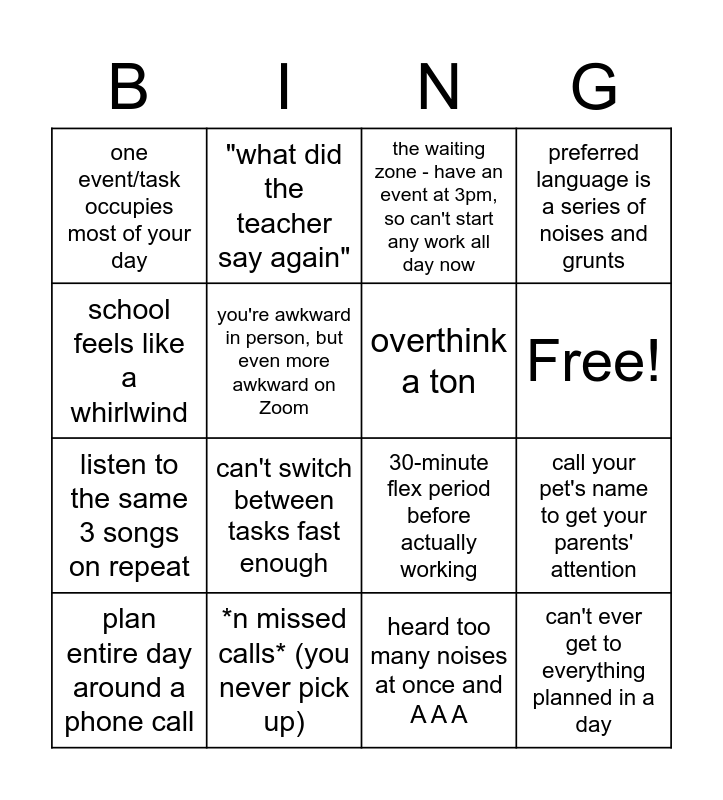 This bingo card has 17 words: heard too many noises at once and A A A, plan entire day around a phone call, the waiting zone - have an event at 3pm, so can't start any work all day now, one event/task occupies most of your day, can't switch between tasks fast enough, preferred language is a series of noises and grunts, call your pet's name to get your parents' attention, overthink a ton, Free!, you're awkward in person, but even more awkward on Zoom, *n missed calls* (you never pick up), 30-minute flex period before actually working, school feels like a whirlwind, "what did the teacher say again", listen to the same 3 songs on repeat, either horribly understimulated or overstimulated and can't ever get to everything planned in a day.