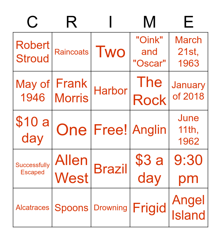 This bingo card has a free space and 29 words: Alcatraces, Citadel, One, Scarface, Robert Stroud, Two, Frank Morris, Allen West, Anglin, Spoons, June 11th, 1962, Angel Island, Drowning, Frigid, January of 2018, Similar, Brazil, Successfully Escaped, March 21st, 1963, $10 a day, $3 a day, Pelican, The Rock, May of 1946, "Oink" and "Oscar", Raincoats, 9:30 pm, Harbor and Cancer.