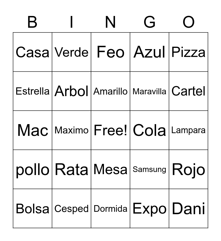 This bingo card has a free space and 29 words: Bolsa, Perro, Maximo, Gato, Casa, Feo, Arbol, Rata, Cola, Cesped, Lampara, Dani, Dormida, Expo, Cartel, Lluvia, Mesa, pollo, Pizza, Mac, Samsung, Alicia, Maravilla, Estrella, Azul, Verde, Rojo, Amarillo and Negro.