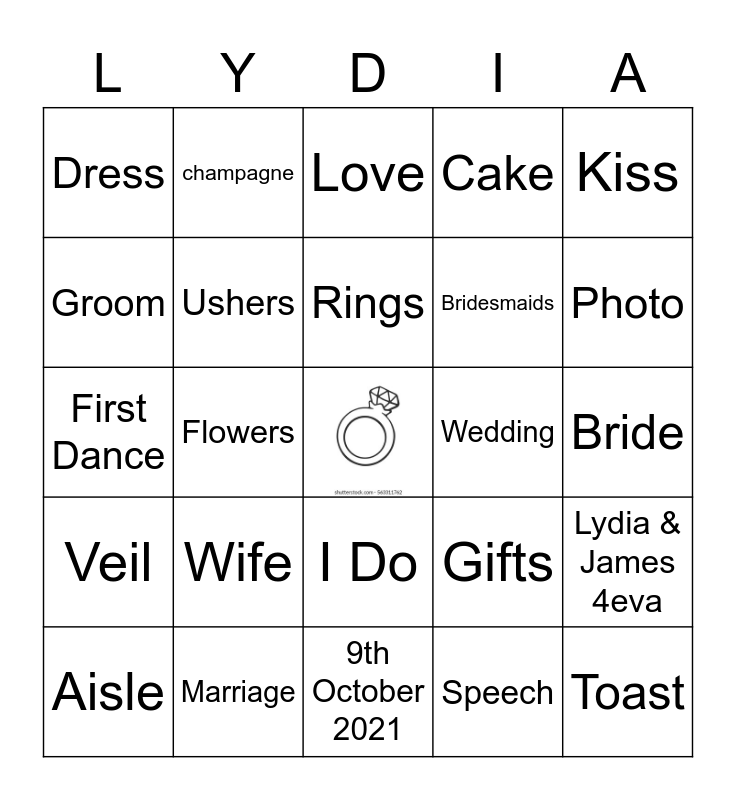 This bingo card has a free space and 24 words: Wife, Marriage, Rings, Aisle, Kiss, Dress, Groom, champagne, Wedding, I Do, Bridesmaids, First Dance, Gifts, Lydia & James 4eva, Ushers, Speech, Bride, Love, Photo, Flowers, Toast, Veil, Cake and 9th October 2021.