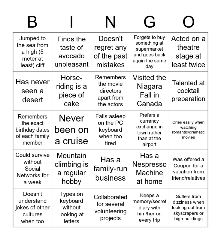 This bingo card has a free space and 24 words: Mountain climbing is a regular hobby, Types on keyboard without looking at letters, Remembers the movie directors apart from the actors, Doesn't understand jokes of other cultures when too, Acted on a theatre stage at least twice, Jumped to the sea from a high (5 meter at least) cliff, Has never seen a desert, Finds the taste of avocado unpleasant, Prefers a currency exchange in town rather than at the airport, Has a family-run business, Visited the Niagara Fall in Canada, Remembers the exact birthday dates of each family member, Has a Nespresso Machine at home, Was offered a Coupon for a vacation from friend/relatives, Horse-riding is a piece of cake, Keeps a memory/secret diary with him/her on every trip, Cries easily when watching romantic/dramatic movies, Doesn't regret any of the past mistakes, Talented at cocktail preparation, Never been on a cruise, Suffers from dizziness when looking out from skyscrapers or high buildings, Could survive without Social Networks for a week, Forgets to buy something at supermarket and goes back again the same day and Collaborated for several volunteering projects.