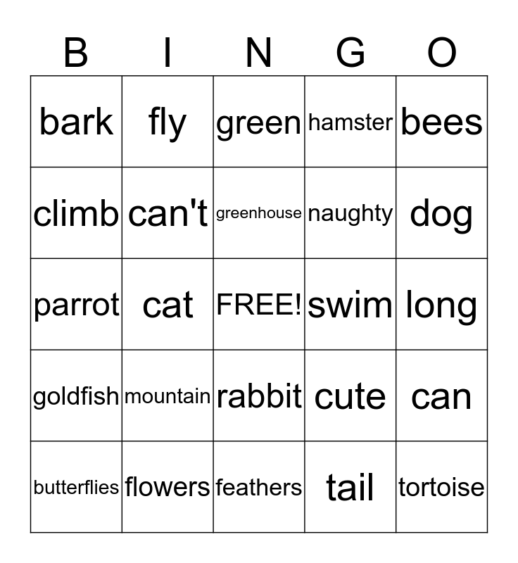 This bingo card has a free space and 24 words: mountain, flowers, greenhouse, butterflies, bees, bark, climb, fly, swim, rabbit, naughty, parrot, cute, can, can't, tail, long, green, dog, cat, tortoise, goldfish, hamster and feathers.