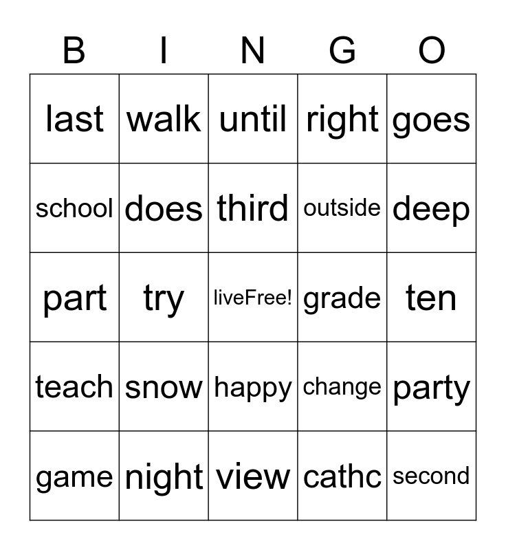 This bingo card has a free space and 26 words: happy, cathc, third, night, goes, last, school, walk, ten, change, outside, part, party, game, try, pick, right, teach, until, second, deep, view, grade, snow, does and together.