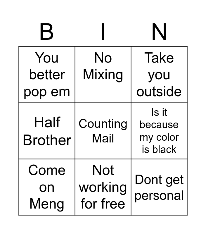 This bingo card has 9 words: Come on Meng, Take you outside, No Mixing, Half Brother, You better pop em, Is it because my color is black, Counting Mail, Dont get personal and Not working for free.