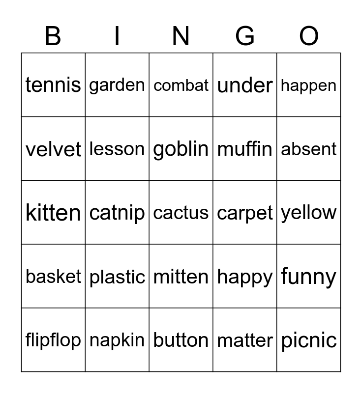 This bingo card has a free space and 24 words: plastic, napkin, goblin, flipflop, happen, tennis, velvet, garden, carpet, mitten, muffin, kitten, happy, funny, lesson, matter, yellow, combat, absent, catnip, picnic, basket, under and button.