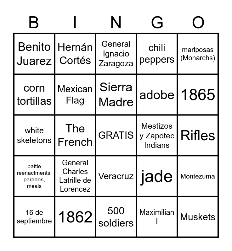 This bingo card has a free space and 29 words: 16 de septiembre, Puebla, The French, mole, Benito Juarez, General Ignacio Zaragoza, Mexican Flag, General Charles Latrille de Lorencez, Mestizos y Zapotec Indians, 1862, Rifles, Muskets, 500 soldiers, Maximilian I, 1865, fireworks, songs, speeches, Veracruz, battle reenactments, parades, meals, mariposas (Monarchs), white skeletons, jade, snorkeling and scuba diving, adobe, corn tortillas, chili peppers, Hernán Cortés, Montezuma, Sierra Madre and Lord Pacal.