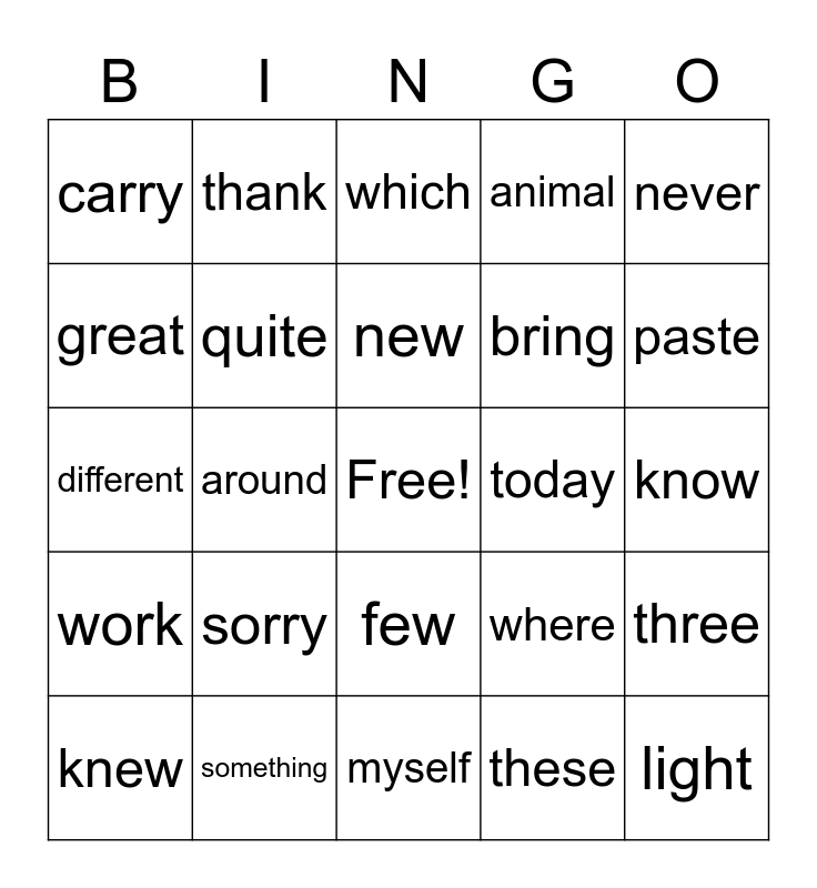 This bingo card has a free space and 24 words: sorry, something, new, knew, never, carry, great, thank, today, few, bring, different, where, three, quite, these, know, which, paste, around, light, work, animal and myself.