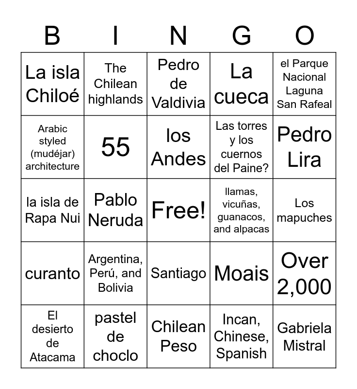 This bingo card has a free space and 25 words: Argentina, Perú, and Bolivia, Chilean Peso, los Andes, El desierto de Atacama, el Parque Nacional Laguna San Rafeal, La isla Chiloé, Arabic styled (mudéjar) architecture, The Chilean highlands, llamas, vicuñas, guanacos, and alpacas, Santiago, Las torres y los cuernos del Paine?, la isla de Rapa Nui, Moais, Over 2,000, 55, mudéjar, Los mapuches, Pedro de Valdivia, Pedro Lira, Pablo Neruda, Gabriela Mistral, pastel de choclo, curanto, La cueca and Incan, Chinese, Spanish.