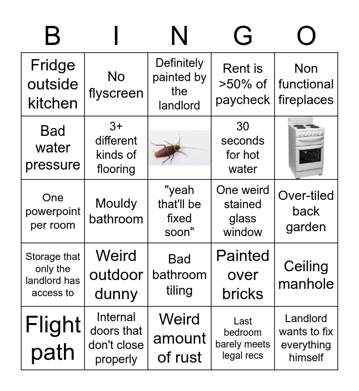 This bingo card has 2 images, a free space and 22 words: Weird outdoor dunny, Internal doors that don't close properly, Flight path, Non functional fireplaces, Fridge outside kitchen, Bad water pressure, No flyscreen, One weird stained glass window, Bad bathroom tiling, 30 seconds for hot water, One powerpoint per room, Painted over bricks, Ceiling manhole, 3+ different kinds of flooring, Last bedroom barely meets legal recs, Over-tiled back garden, Definitely painted by the landlord, Mouldy bathroom, Landlord wants to fix everything himself, Storage that only the landlord has access to, Rent is >50% of paycheck and Weird amount of rust.