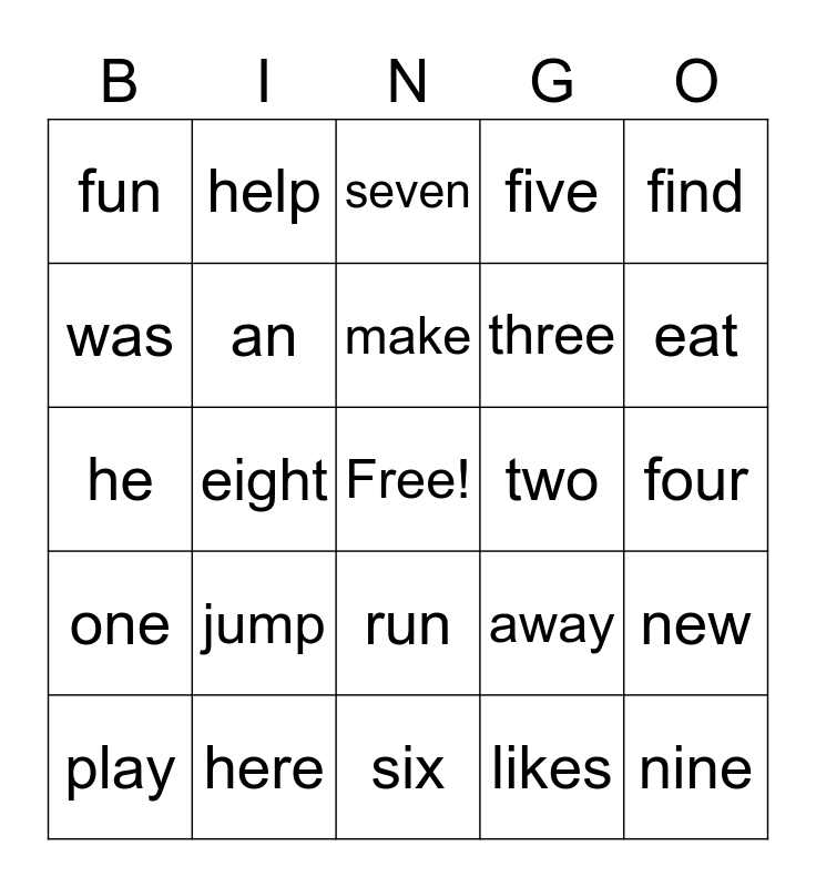 This bingo card has a free space and 24 words: jump, here, make, play, find, fun, was, help, two, run, three, he, away, new, an, likes, four, seven, eat, eight, nine, one, five and six.