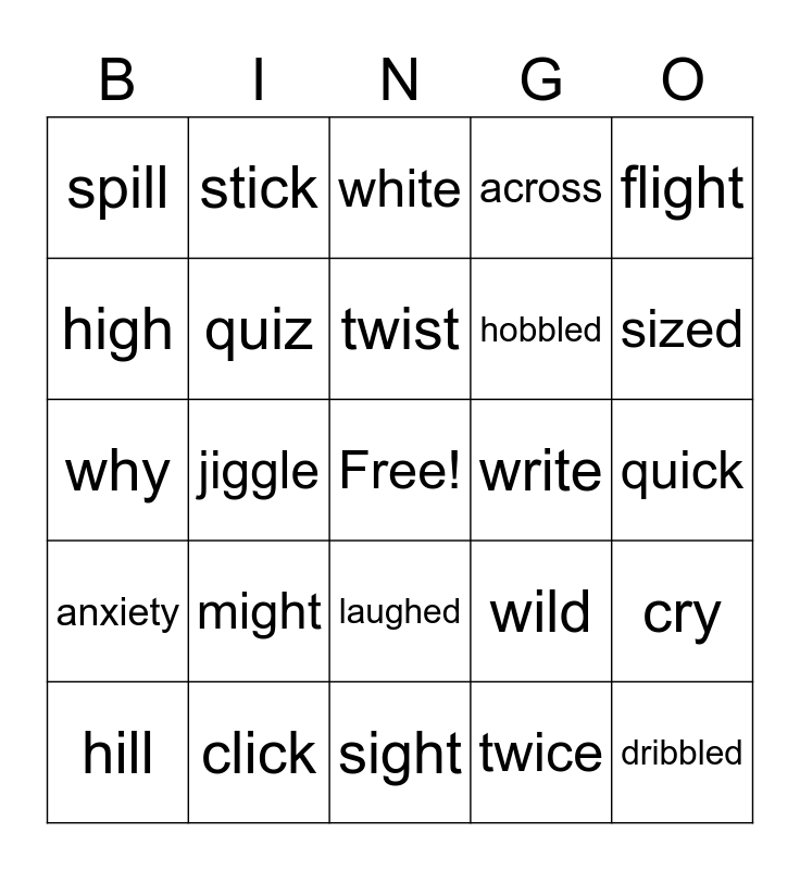 This bingo card has a free space and 24 words: hill, might, twist, twice, flight, spill, stick, white, write, quick, why, quiz, wild, cry, high, click, sight, across, sized, anxiety, jiggle, laughed, hobbled and dribbled.