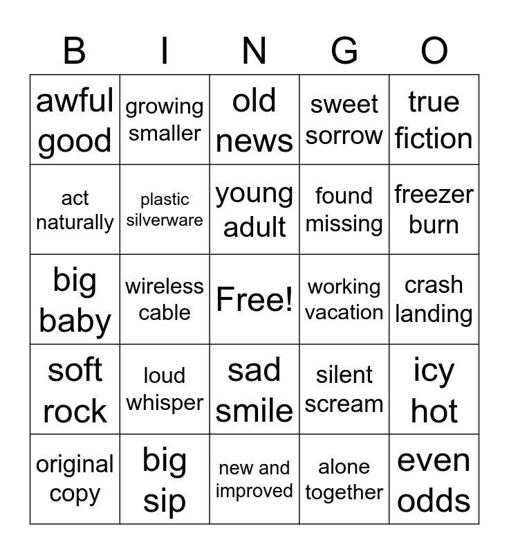 This bingo card has a free space and 31 words: new and improved, educated guess, wireless cable, quiet children, awful good, old news, plastic silverware, silent scream, working vacation, alone together, crash landing, even odds, definite maybe, exact estimate, freezer burn, guest host, icy hot, loud whisper, soft rock, sad smile, true fiction, small crowd, original copy, growing smaller, found missing, act naturally, sweet sorrow, big baby, big sip, young adult and second best.