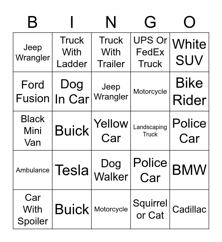 This bingo card has a free space and 24 words: Tesla, Buick, Jeep Wrangler, Car With Spoiler, White SUV, Jeep Wrangler, Ford Fusion, Truck With Ladder, Landscaping Truck, Dog Walker, Motorcycle, Black Mini Van, Police Car, BMW, Dog In Car, Squirrel or Cat, Police Car, Truck With Trailer, Bike Rider, Buick, Cadillac, Ambulance, UPS Or FedEx Truck and Motorcycle.