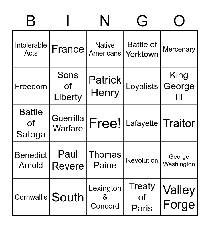 This bingo card has a free space and 28 words: George Washington, Patriots, Loyalists, Treaty of Paris, Freedom, Native Americans, France, Benedict Arnold, Lafayette, Cornwallis, Battle of Satoga, Battle of Yorktown, South, Lexington & Concord, King George III, Thomas Jefferson, Paul Revere, Sons of Liberty, Patrick Henry, Thomas Paine, Intolerable Acts, Battle of Bunker Hill, Valley Forge, Guerrilla Warfare, Traitor, Revolution, Mercenary and Neutral.