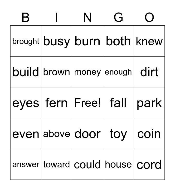 This bingo card has a free space and 24 words: above, toward, money, answer, knew, brought, build, busy, fall, door, enough, eyes, toy, coin, brown, house, park, burn, dirt, fern, cord, even, both and could.