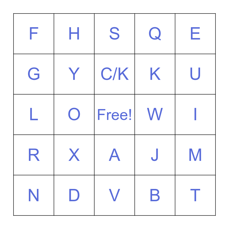 This bingo card has a free space and 26 words: A, B, C/K, D, E, F, G, H, I, J, K, L, M, N, O, P, Q, R, S, T, U, V, W, X, Y and Z.