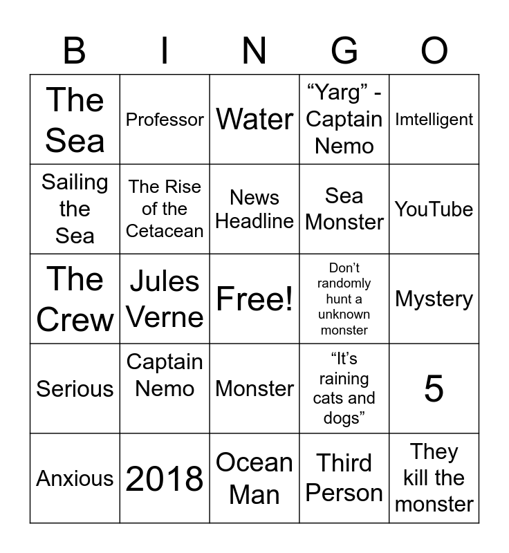 This bingo card has a free space and 24 words: Captain Nemo, 2018, News Headline, Anxious, Imtelligent, The Sea, Sailing the Sea, Professor, Don’t randomly hunt a unknown monster, Monster, Sea Monster, The Crew, “It’s raining cats and dogs”, 5, The Rise of the Cetacean, Third Person, Mystery, Water, YouTube, Jules Verne, They kill the monster, Serious, “Yarg” - Captain Nemo and Ocean Man.