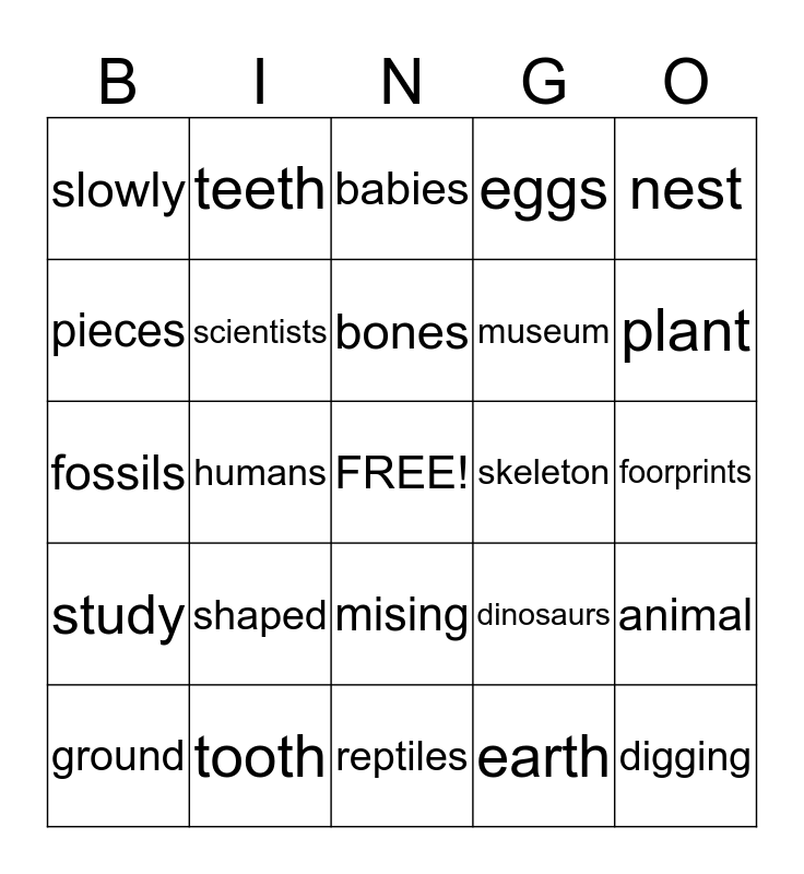 This bingo card has a free space and 24 words: shaped, tooth, bones, ground, nest, slowly, pieces, teeth, skeleton, mising, museum, fossils, dinosaurs, animal, scientists, earth, foorprints, babies, plant, humans, digging, study, eggs and reptiles.