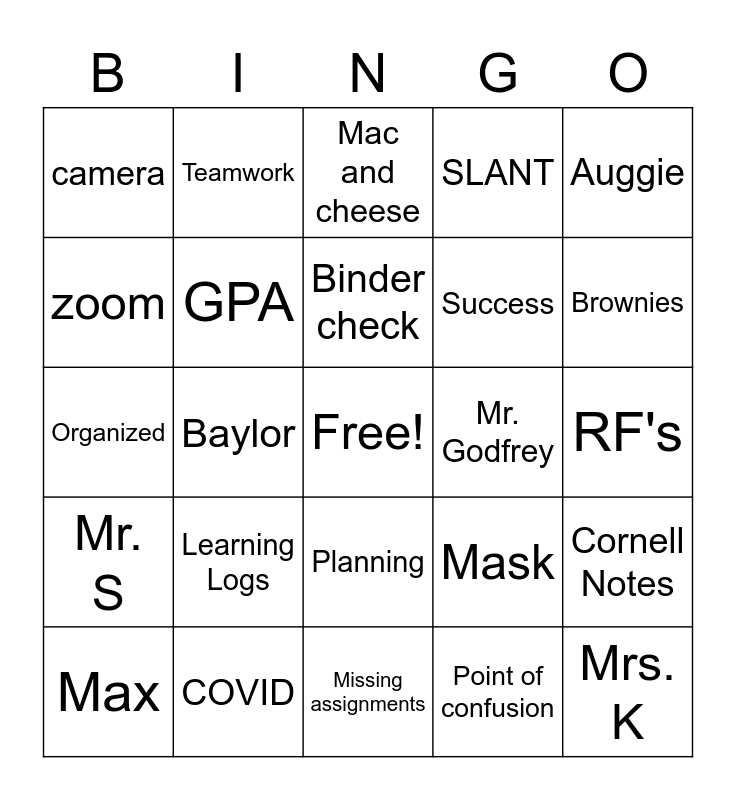 This bingo card has a free space and 24 words: Learning Logs, COVID, Binder check, Max, Auggie, camera, zoom, Teamwork, Mr. Godfrey, Planning, Success, Organized, Mask, Cornell Notes, GPA, Point of confusion, RF's, Mac and cheese, Brownies, Baylor, Mrs. K, Mr. S, SLANT and Missing assignments.