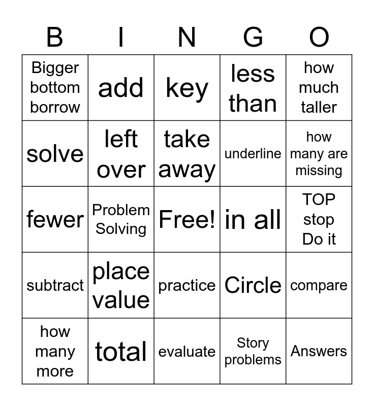 This bingo card has a free space and 27 words: Circle, Box, underline, evaluate, solve, key, add, subtract, in all, compare, fewer, less than, how many more, total, how many are missing, plus, left over, take away, place value, Bigger bottom borrow, TOP stop Do it, Story problems, Problem Solving, Answers, practice, how much taller and how much longer.
