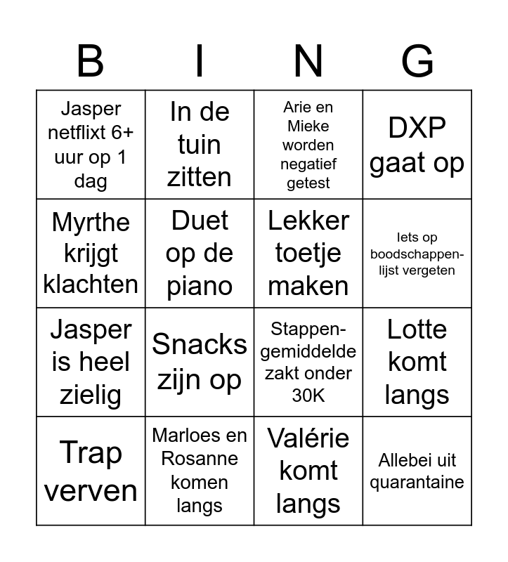 This bingo card has 16 words: Marloes en Rosanne komen langs, Lotte komt langs, Arie en Mieke worden negatief getest, Jasper netflixt 6+ uur op 1 dag, Jasper is heel zielig, In de tuin zitten, Stappen-gemiddelde zakt onder 30K, Valérie komt langs, Myrthe krijgt klachten, Duet op de piano, Trap verven, DXP gaat op, Snacks zijn op, Iets op boodschappen-lijst vergeten, Lekker toetje maken and Allebei uit quarantaine.
