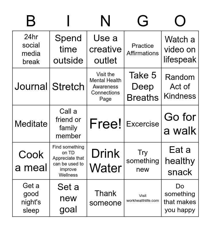 This bingo card has a free space and 24 words: Find something on TD Appreciate that can be used to improve Wellness, Set a new goal, Visit the Mental Health Awareness Connections Page, Get a good night's sleep, Watch a video on lifespeak, 24hr social media break, Journal, Spend time outside, Excercise, Drink Water, Take 5 Deep Breaths, Meditate, Try something new, Eat a healthy snack, Stretch, Visit workhealthlife.com, Go for a walk, Use a creative outlet, Random Act of Kindness, Call a friend or family member, Do something that makes you happy, Cook a meal, Practice Affirmations and Thank someone.