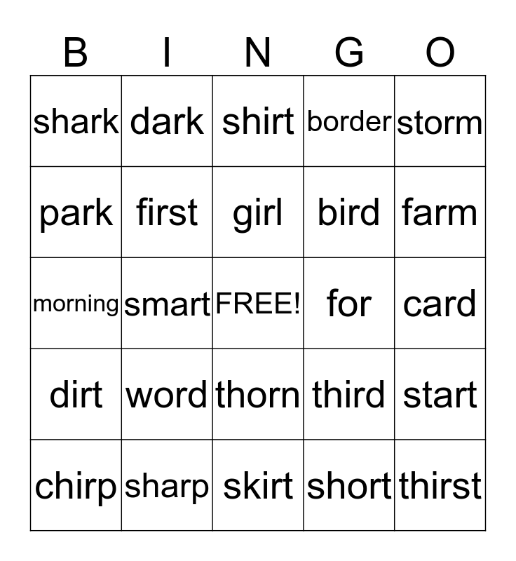 This bingo card has a free space and 24 words: word, sharp, girl, chirp, storm, shark, park, dark, for, thorn, bird, morning, third, start, first, short, card, shirt, farm, smart, thirst, dirt, border and skirt.