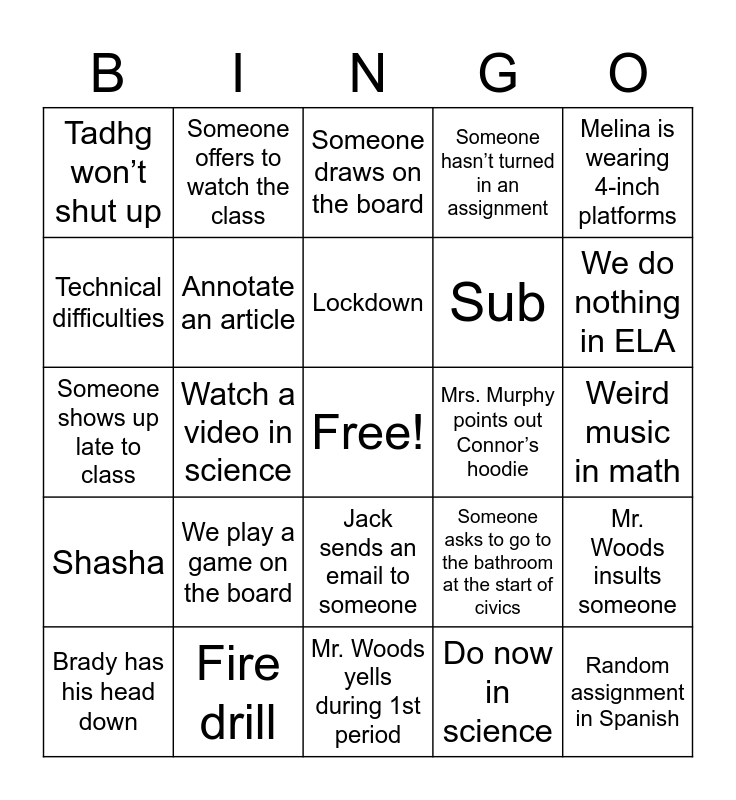 This bingo card has a free space and 31 words: Mr. Woods yells during 1st period, Mr. Meo gets called a clown, Watch a video in science, Zoom kid isn’t paying attention, Tadhg won’t shut up, Someone draws on the board, Annotate an article, Someone asks to go to the bathroom at the start of civics, Mrs. Murphy points out Connor’s hoodie, Do now in science, Weird music in math, Random assignment in Spanish, Go outside in gym, Melina “isn’t here” in civics, We do nothing in ELA, Copy and paste post in advisory, Mr. Woods insults someone, We play a game on the board, Shasha, Jack sends an email to someone, Melina is wearing 4-inch platforms, LAB in science, Brady has his head down, Someone offers to watch the class, Sub, Technical difficulties, Someone hasn’t turned in an assignment, Someone shows up late to class, Fire drill, Lockdown and Kahoot!.