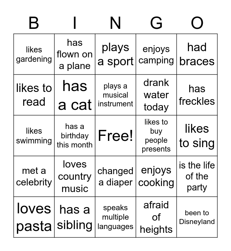 This bingo card has a free space and 24 words: loves country music, has a sibling, plays a musical instrument, loves pasta, had braces, likes gardening, likes to read, has flown on a plane, likes to buy people presents, changed a diaper, drank water today, likes swimming, enjoys cooking, is the life of the party, has a cat, afraid of heights, likes to sing, plays a sport, has freckles, has a birthday this month, been to Disneyland, met a celebrity, enjoys camping and speaks multiple languages.
