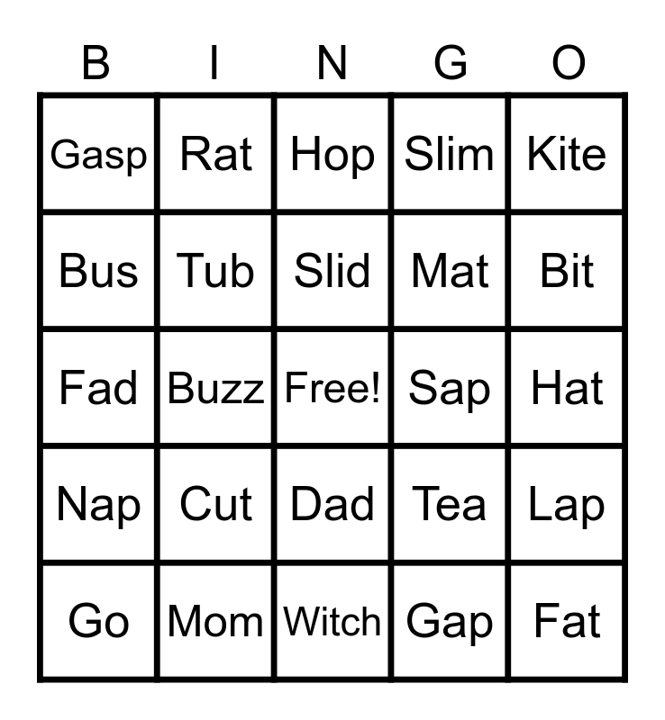 This bingo card has a free space and 34 words: Gasp, Tab, Cat, Bat, Hat, Bus, Tub, Witch, Mat, Fat, Fad, Rat, Gap, Leaf, Nap, Buzz, Dad, Sap, Lap, Go, Mom, Top, Slim, Bit, Fine, Cut, Hop, Kit, Kite, Gasp, Dot, Slid, Tea and Pet.