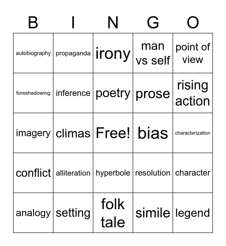 This bingo card has a free space and 25 words: alliteration, folk tale, poetry, analogy, point of view, autobiography, foreshadowing, propaganda, bias, hyperbole, prose, imagery, resolution, character, inference, rhythm, characterization, irony, rising action, climas, legend, setting, conflict, man vs self and simile.