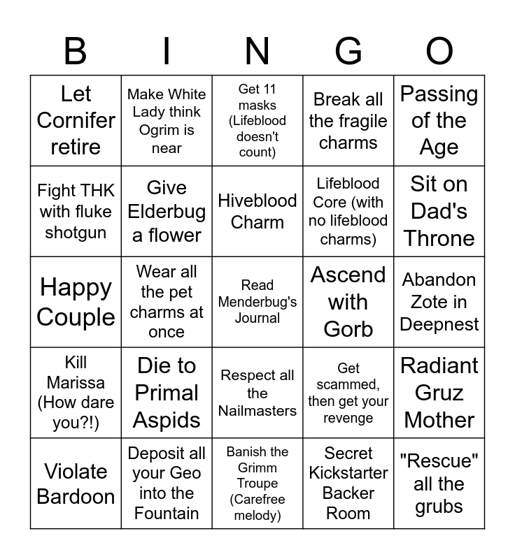 This bingo card has a free space and 24 words: Die to Primal Aspids, Deposit all your Geo into the Fountain, Hiveblood Charm, Violate Bardoon, Passing of the Age, Let Cornifer retire, Fight THK with fluke shotgun, Make White Lady think Ogrim is near, Ascend with Gorb, Respect all the Nailmasters, Lifeblood Core (with no lifeblood charms), Happy Couple, Get scammed, then get your revenge, Radiant Gruz Mother, Give Elderbug a flower, Secret Kickstarter Backer Room, Abandon Zote in Deepnest, Get 11 masks (Lifeblood doesn't count), Sit on Dad's Throne, Wear all the pet charms at once, "Rescue" all the grubs, Kill Marissa (How dare you?!), Break all the fragile charms and Banish the Grimm Troupe (Carefree melody).