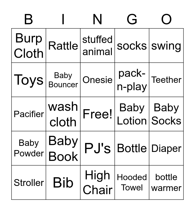 This bingo card has a free space and 27 words: Bottle, diaper pail, pack-n-play, High Chair, Toys, stuffed animal, Rattle, Baby Powder, Baby Lotion, Diaper, Pacifier, socks, Stroller, Bib, Teether, Blanket, Baby Bouncer, Onesie, Baby Book, Burp Cloth, Baby Socks, Hooded Towel, wash cloth, bottle warmer, PJ's, swing and night light.