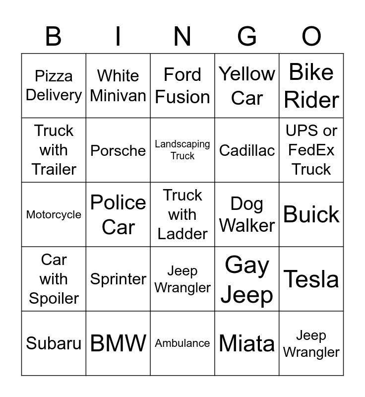 This bingo card has a free space and 24 words: Sprinter, BMW, Landscaping Truck, Subaru, Bike Rider, Pizza Delivery, Truck with Trailer, White Minivan, Dog Walker, Jeep Wrangler, Cadillac, Motorcycle, Gay Jeep, Tesla, Porsche, Miata, Buick, Ford Fusion, UPS or FedEx Truck, Police Car, Jeep Wrangler, Car with Spoiler, Yellow Car and Ambulance.