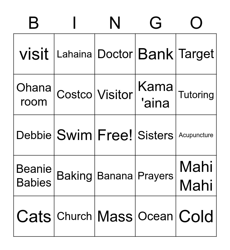 This bingo card has a free space and 29 words: Cats, Clyde, Swim, Amazon, visit, Doctor, Costco, Baking, Sisters, Church, Acupuncture, Cold, Mass, Ocean, Tutoring, School, Banana, Beanie Babies, Target, Debbie, Prayers, Swap meet, Kama 'aina, Ohana room, Bank, Lahaina, Mahi Mahi, Visitor and Kindle.