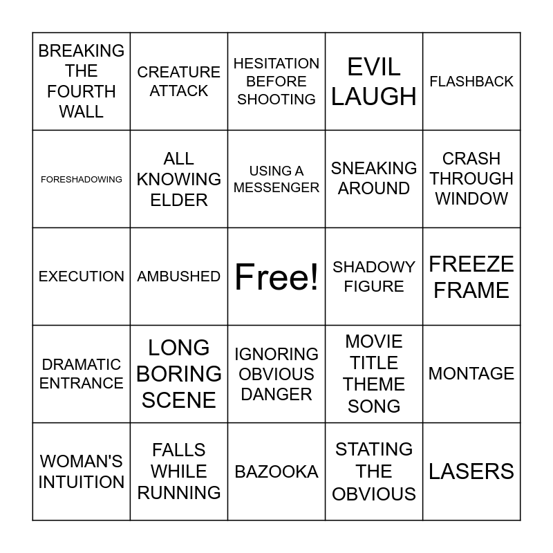 This bingo card has a free space and 24 words: LONG BORING SCENE, FALLS WHILE RUNNING, USING A MESSENGER, WOMAN'S INTUITION, FLASHBACK, BREAKING THE FOURTH WALL, FORESHADOWING, CREATURE ATTACK, SHADOWY FIGURE, IGNORING OBVIOUS DANGER, SNEAKING AROUND, EXECUTION, MOVIE TITLE THEME SONG, MONTAGE, ALL KNOWING ELDER, STATING THE OBVIOUS, FREEZE FRAME, HESITATION BEFORE SHOOTING, CRASH THROUGH WINDOW, AMBUSHED, LASERS, DRAMATIC ENTRANCE, EVIL LAUGH and BAZOOKA.