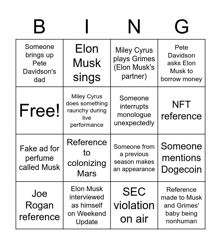 This bingo card has 16 words: Elon Musk interviewed as himself on Weekend Update, Someone mentions Dogecoin, Miley Cyrus plays Grimes (Elon Musk's partner), Someone brings up Pete Davidson's dad, Fake ad for perfume called Musk, Elon Musk sings, Someone from a previous season makes an appearance, SEC violation on air, Free!, Miley Cyrus does something raunchy during live performance, Joe Rogan reference, Pete Davidson asks Elon Musk to borrow money, Reference to colonizing Mars, NFT reference, Someone interrupts monologue unexpectedly and Reference made to Musk and Grimes' baby being nonhuman.