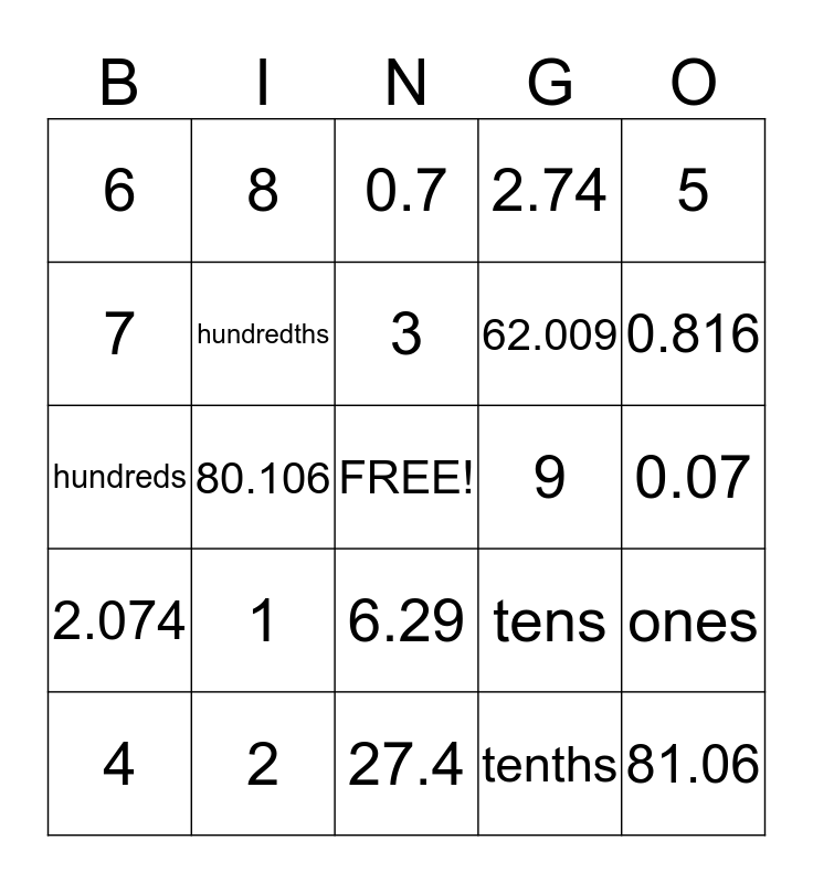 This bingo card has a free space and 24 words: 1, 2, 3, 4, 5, 6, 7, 8, 9, 6.29, 62.009, hundreds, tens, ones, hundredths, tenths, 0.07, 0.7, 0.816, 80.106, 81.06, 2.074, 2.74 and 27.4.