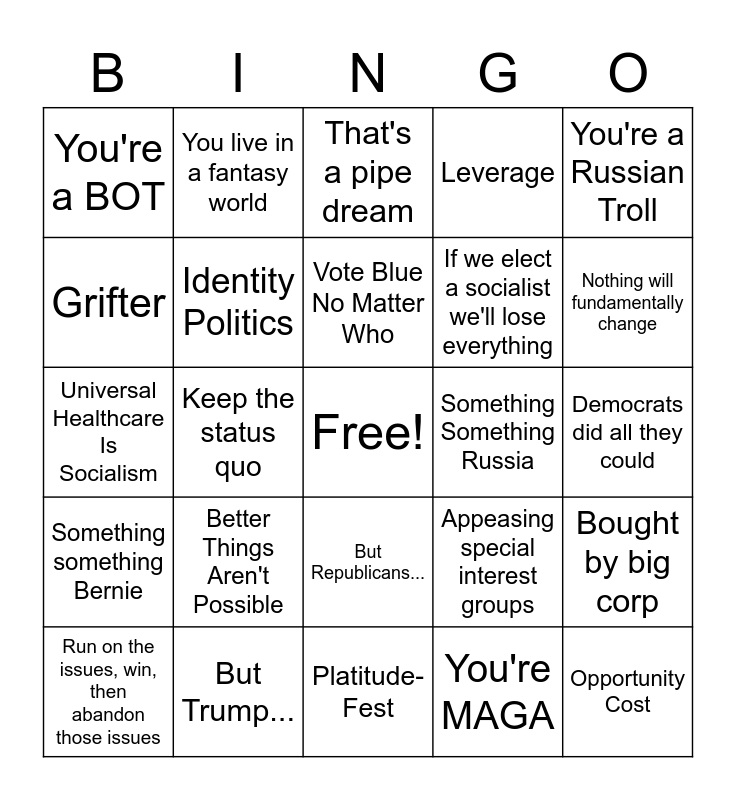 This bingo card has a free space and 25 words: Something something Bernie, But Trump..., But Republicans..., You're MAGA, You're a Russian Troll, You're a BOT, You live in a fantasy world, That's a pipe dream, Something Something Russia, Democrats did all they could, Grifter, Identity Politics, Appeasing special interest groups, Bought by big corp, Platitude-Fest, Run on the issues, win, then abandon those issues, Keep the status quo, Vote Blue No Matter Who, If we elect a socialist we'll lose everything, Nothing will fundamentally change, Universal Healthcare Is Socialism, Better Things Aren't Possible, Political Capital, Leverage and Opportunity Cost.