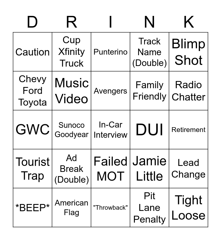 This bingo card has a free space and 24 words: Ad Break (Double), American Flag, Avengers, *BEEP*, Blimp Shot, Caution, Chevy Ford Toyota, Cup Xfinity Truck, DUI, Failed MOT, Family Friendly, GWC, Jamie Little, Lead Change, Music Video, Pit Lane Penalty, Retirement, Punterino, Radio Chatter, Sunoco Goodyear, Tight Loose, Tourist Trap, Track Name (Double) and "Throwback".
