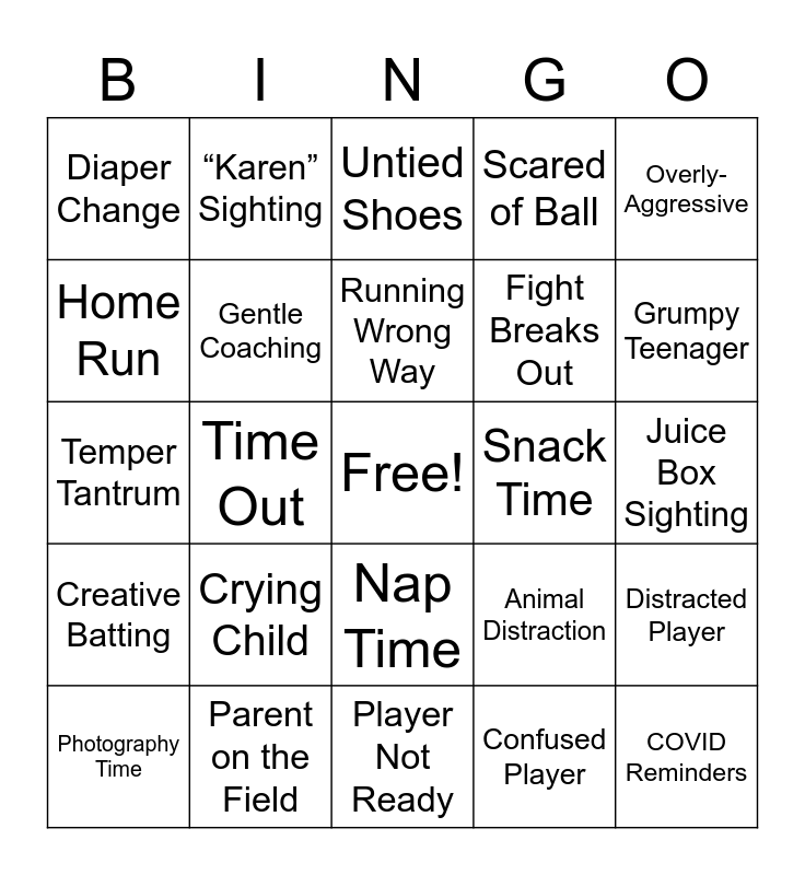 This bingo card has a free space and 24 words: Crying Child, Parent on the Field, Running Wrong Way, Photography Time, Overly-Aggressive, Diaper Change, Home Run, “Karen” Sighting, Snack Time, Nap Time, Fight Breaks Out, Temper Tantrum, Animal Distraction, Distracted Player, Gentle Coaching, Confused Player, Juice Box Sighting, Untied Shoes, Grumpy Teenager, Time Out, COVID Reminders, Creative Batting, Scared of Ball and Player Not Ready.