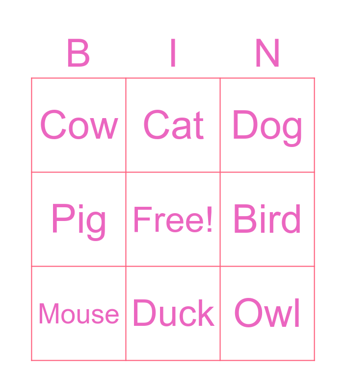 This bingo card has a free space and 8 words: Bird, Dog, Cat, Mouse, Cow, Owl, Pig and Duck.