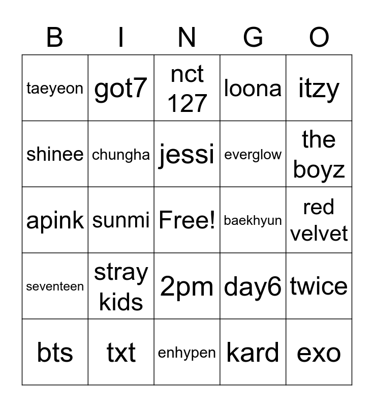 This bingo card has a free space and 24 words: stray kids, txt, jessi, bts, itzy, taeyeon, shinee, got7, baekhyun, 2pm, everglow, apink, day6, twice, chungha, kard, red velvet, nct 127, the boyz, sunmi, exo, seventeen, loona and enhypen.